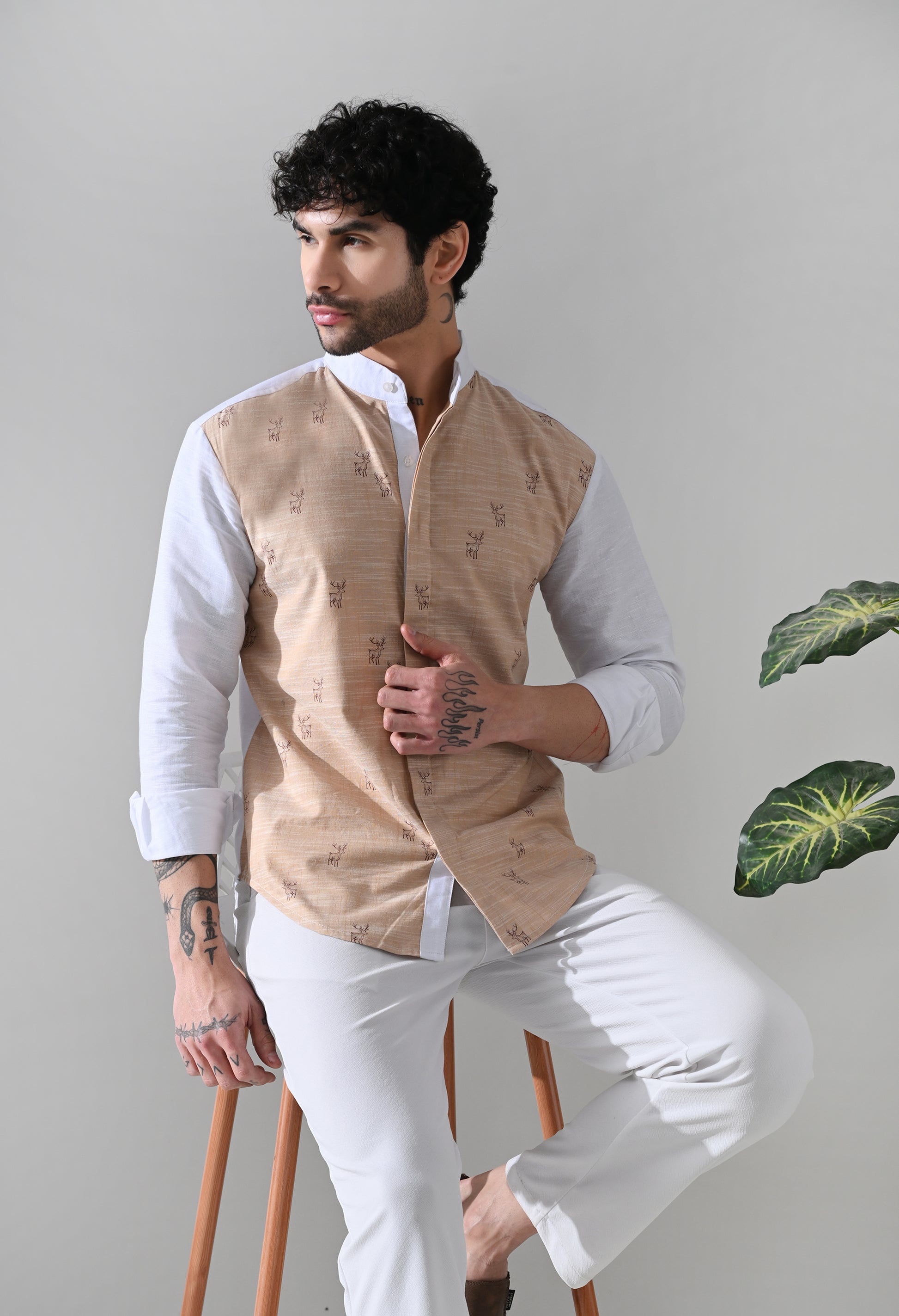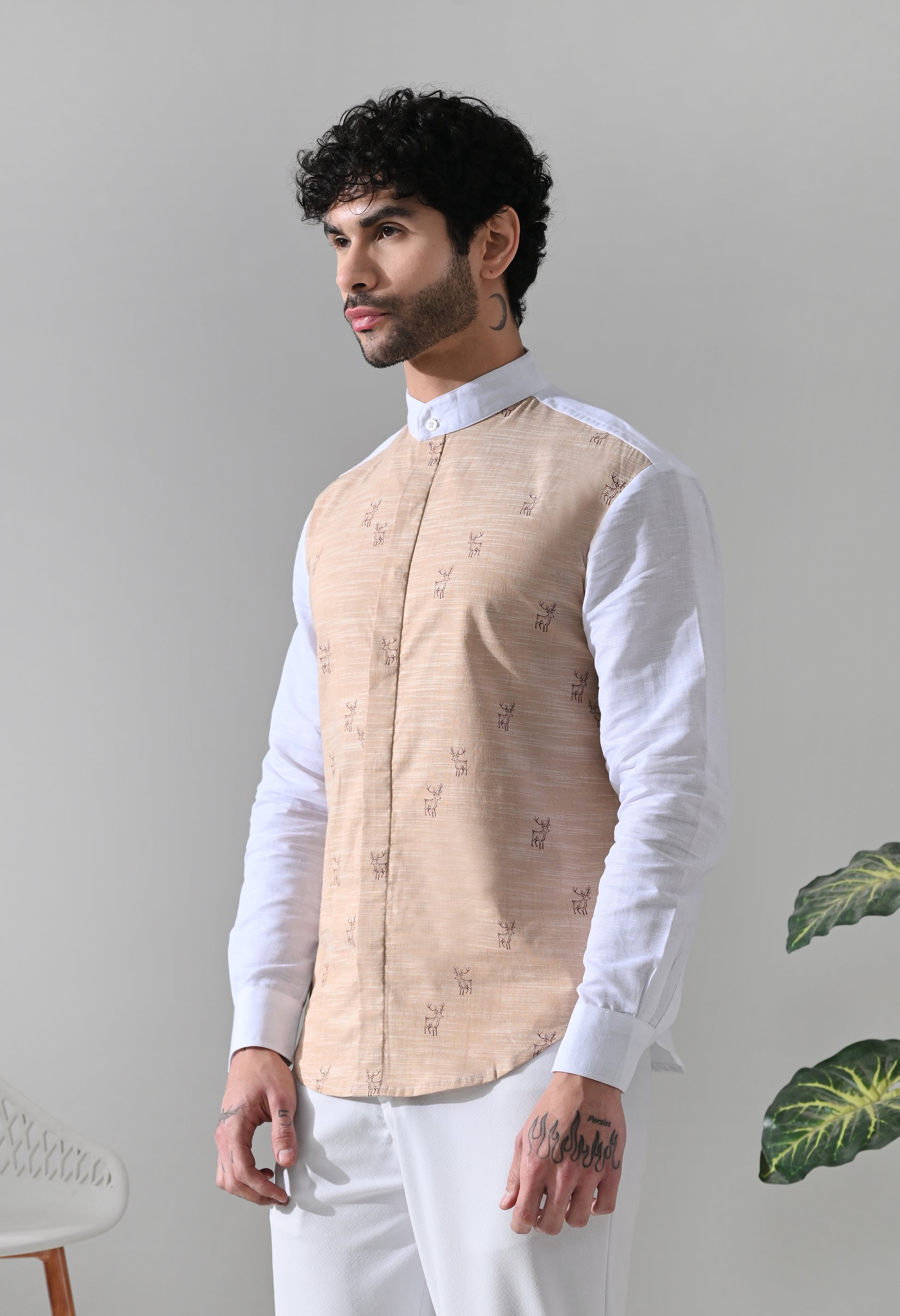 The highlight of the design is the subtle deer motif print across the front, symbolizing grace, strength, and quiet confidence. Set against a warm, earthy tone panel and balanced with a crisp white base, the print adds character without overpowering the silhouette. The thoughtful placement keeps the look sophisticated and versatile.